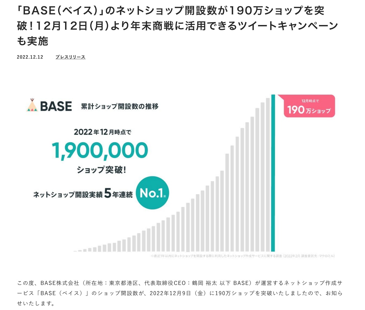 ※ちなみに、「BASE(ベイス)」全体のショップ開設数は、2022年12月9日(金)に190万ショップを突破しています。